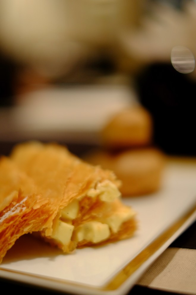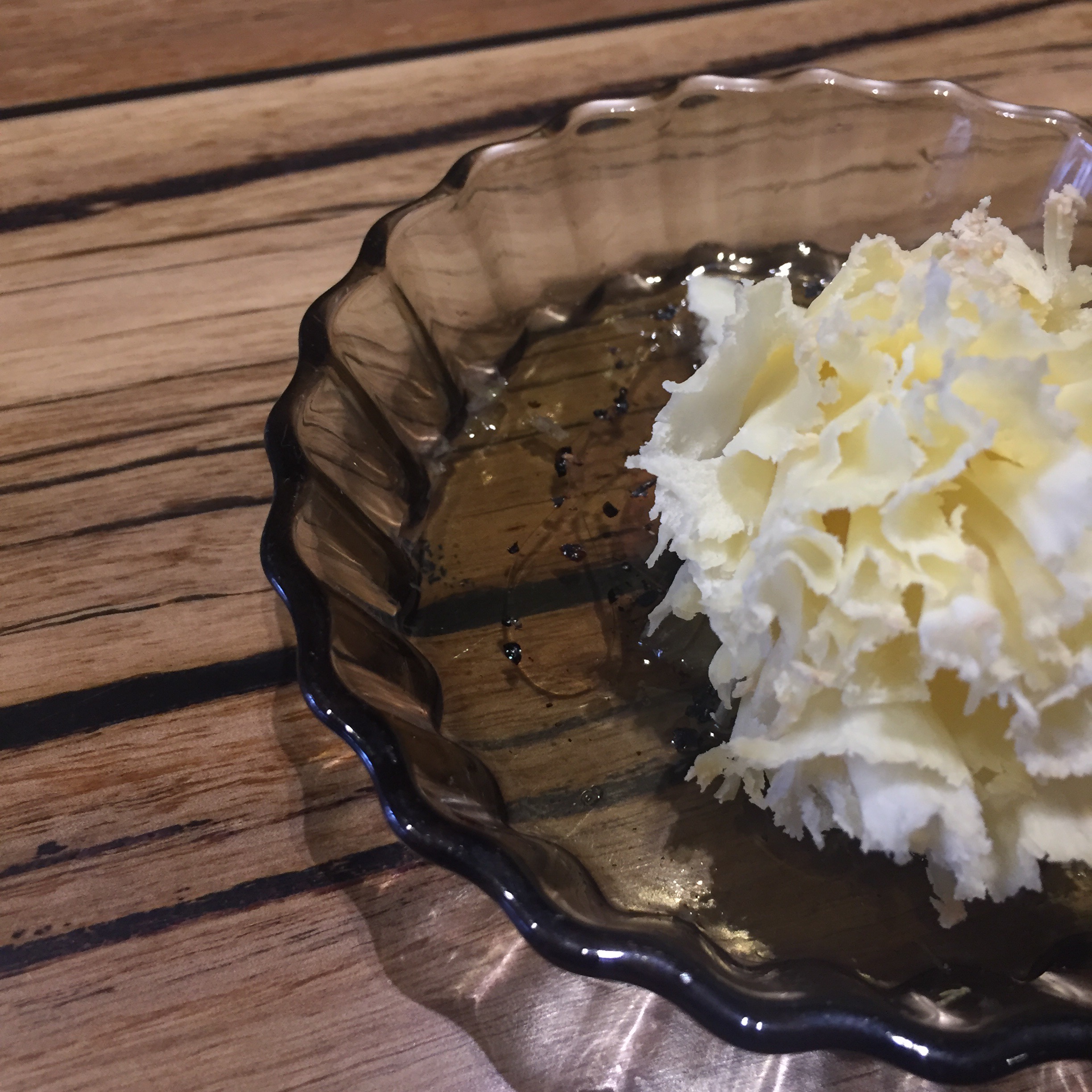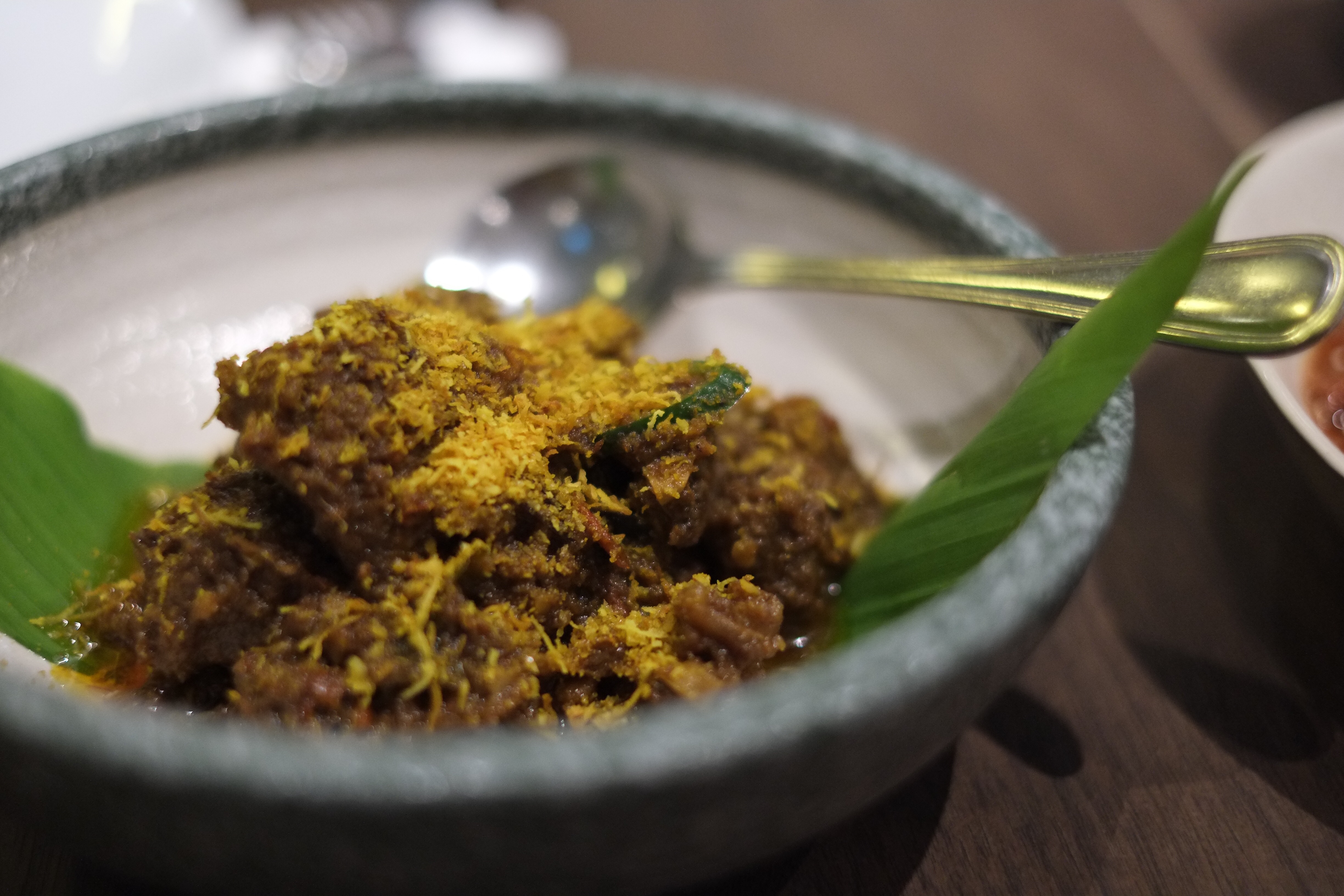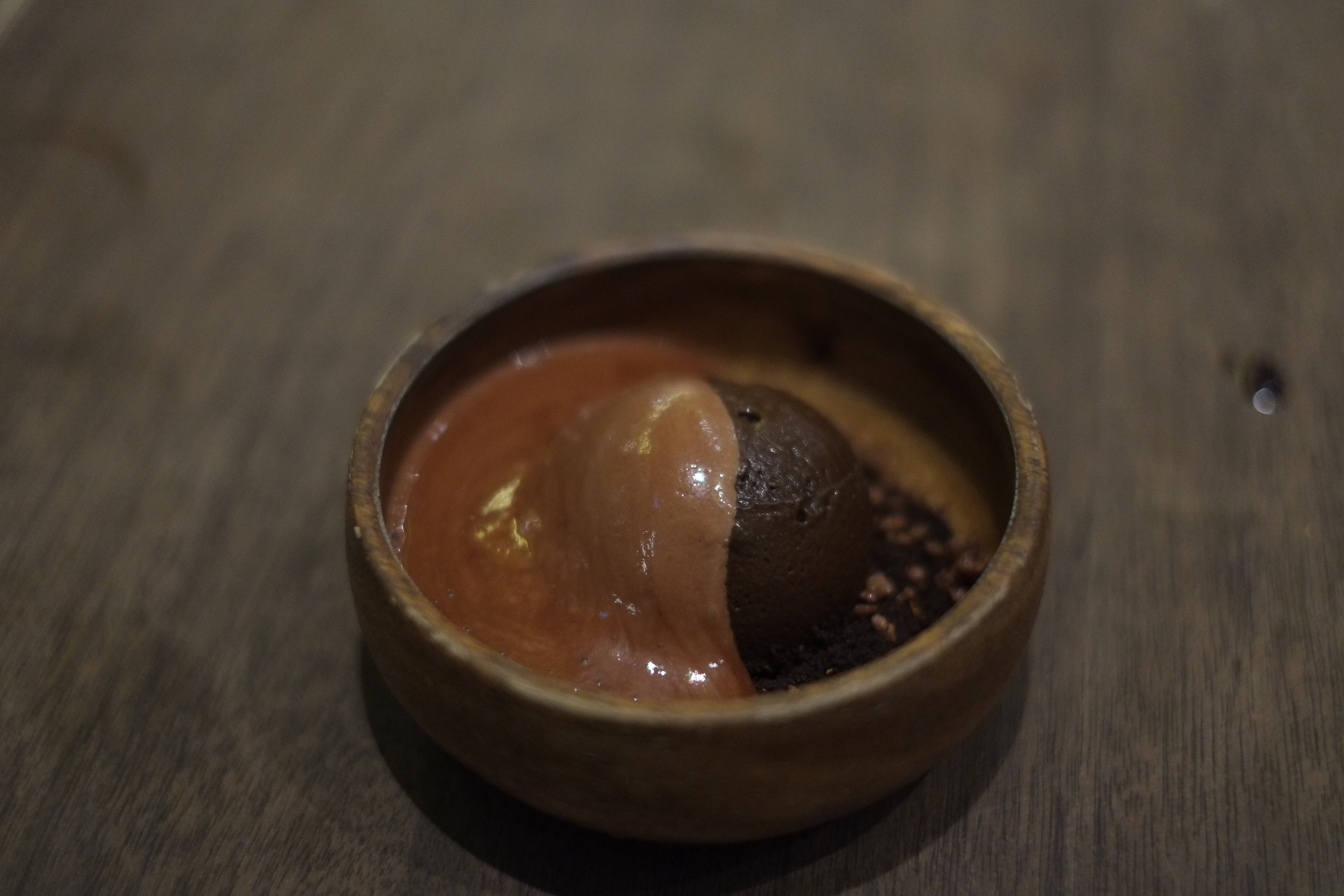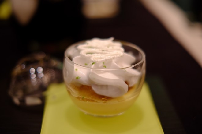 Final dishes were Stir Fried Drop Noodles in red curry spice, betel leaf and duck spare parts. This is a perfect dish for such cold weather, hearty, warm, spicy, earthy. The noodles were accompanied with one of the best versions of stir fried Chinese broccoli. I know.. how can it be.. In this dish, brocollini is used with garlic chive flower and its wok friend with soy and sweetened with ground chestnut. It was so good on its own but paired with the spicy noodles, it was harmonious.