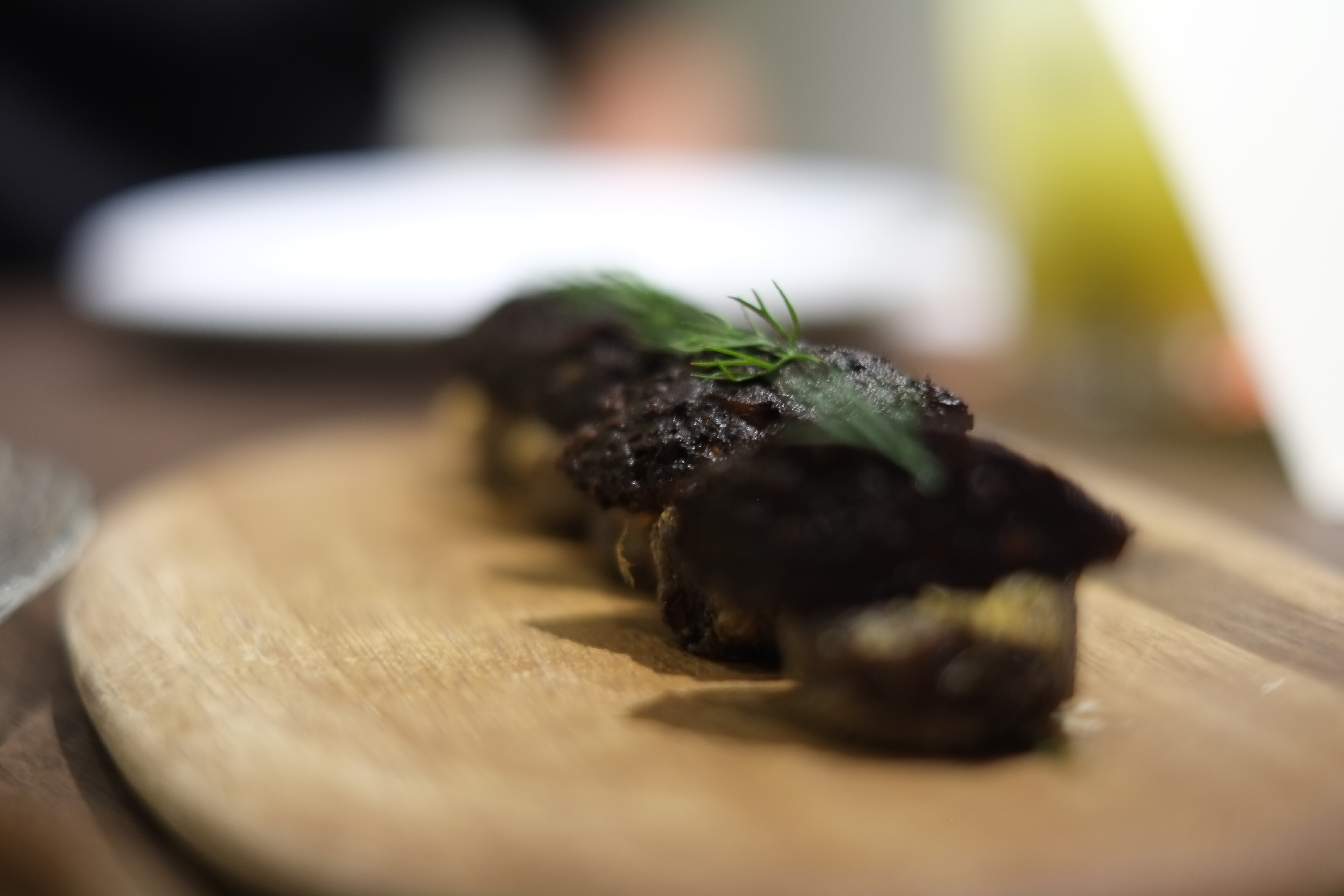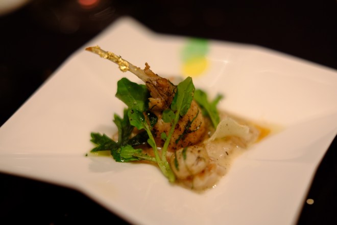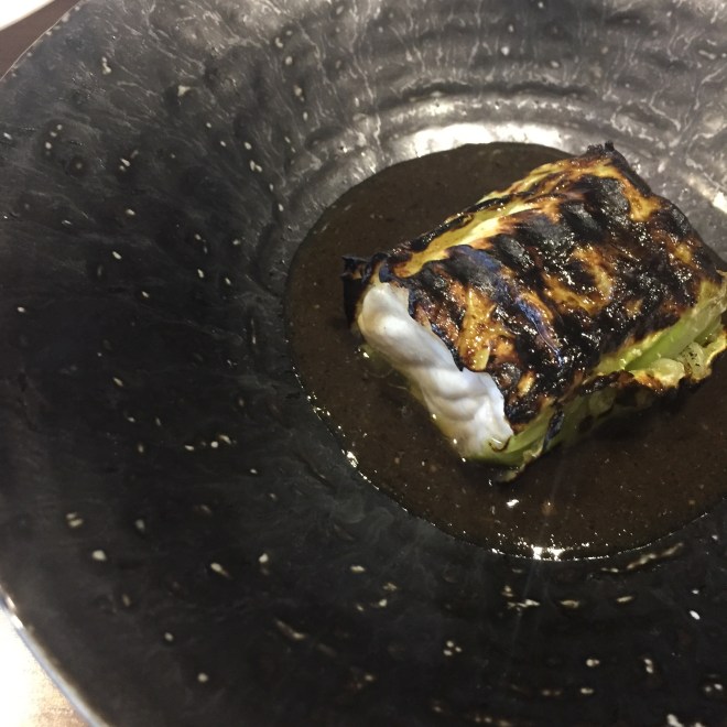 Food came in very good progression, after 10-12 mins, the blood sausage pudding came out. This was delicate, subtle and very very tasty. It was still very warm to the touch on top of a cos lettuce dusted with spices and a hint of ginger. There was delicate balance between a mild mineral taste, small bits of fat and the crispness of the exterior after a quick sear. No photo. too good to pause for that!