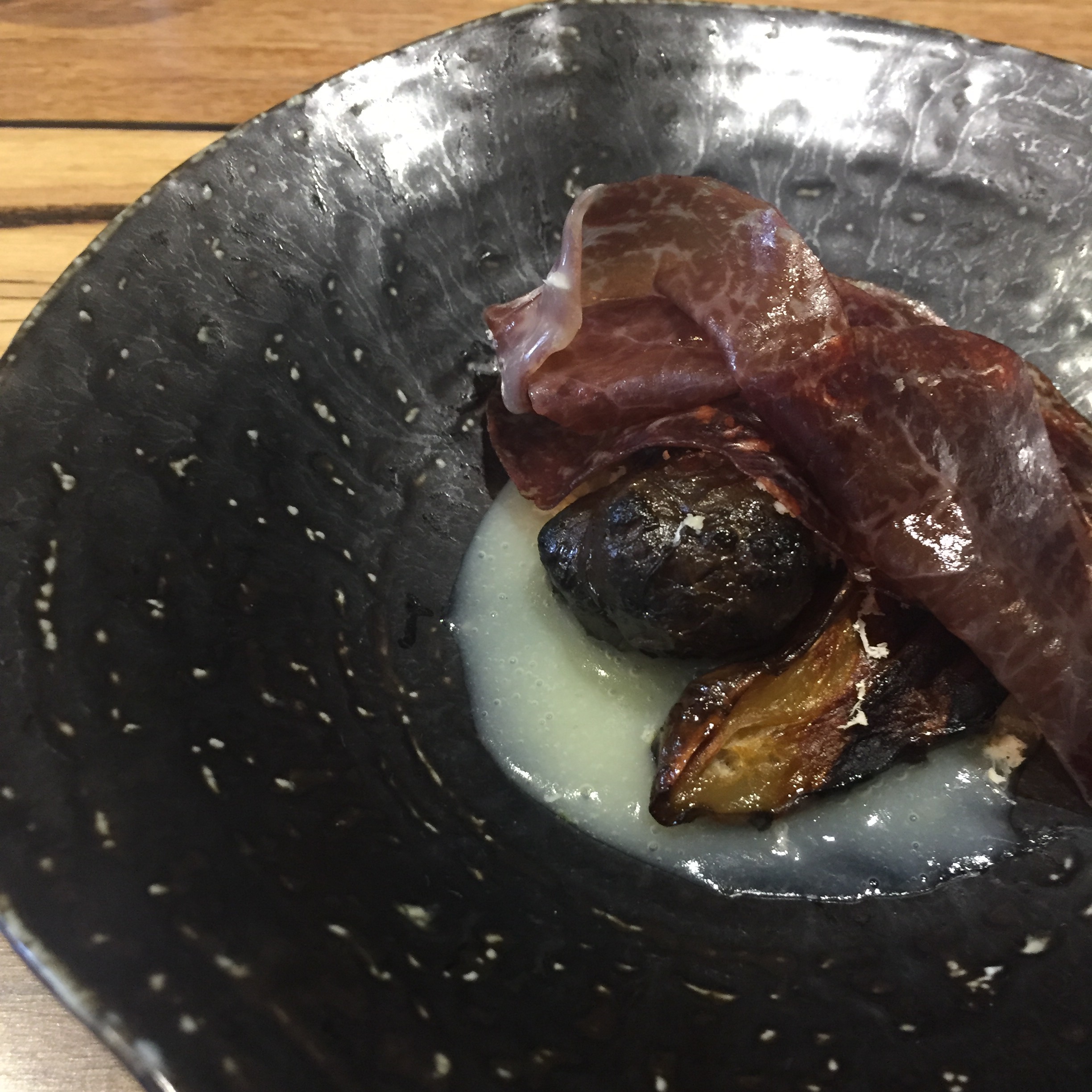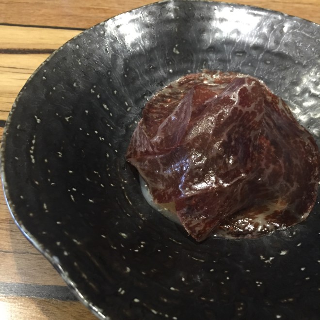 Second course was the Grilled Lamb’s Tongue Tostada with bamboo and mustard. The lamb was gently grilled on coals until the connective tissue broke down and a beautiful crust was formed on the outside. The toastada had the right denseness and crunch to hold onto the lengua and the mustard dressing. Fantastic!