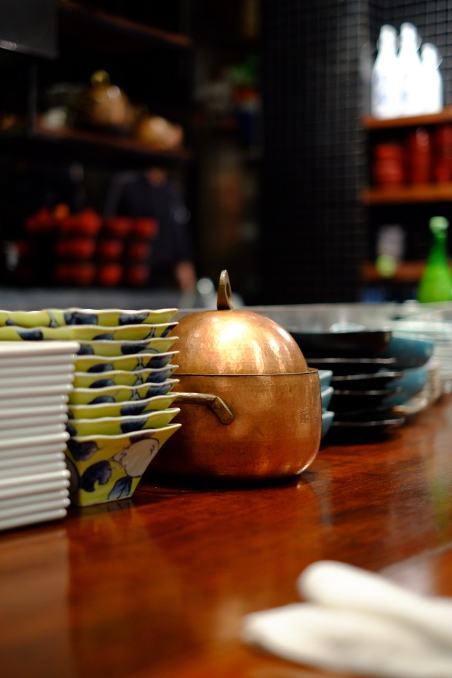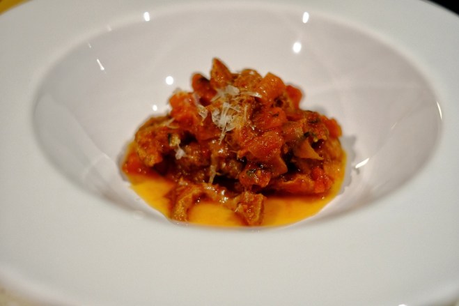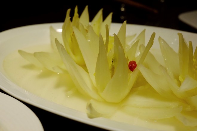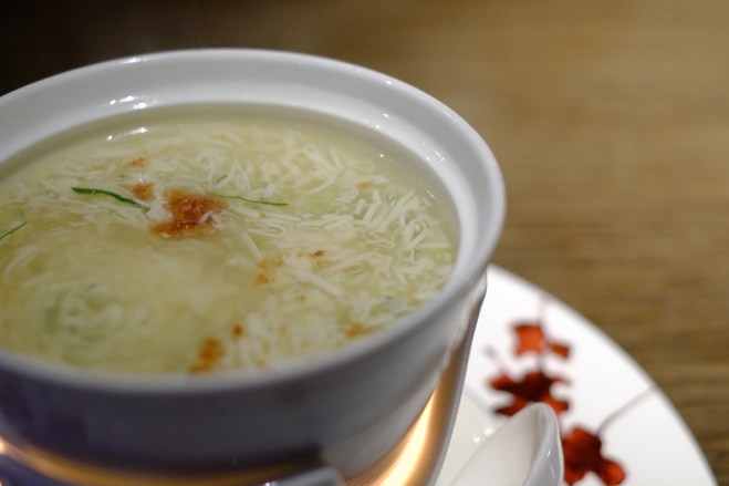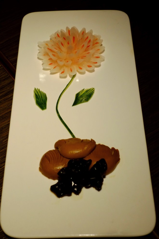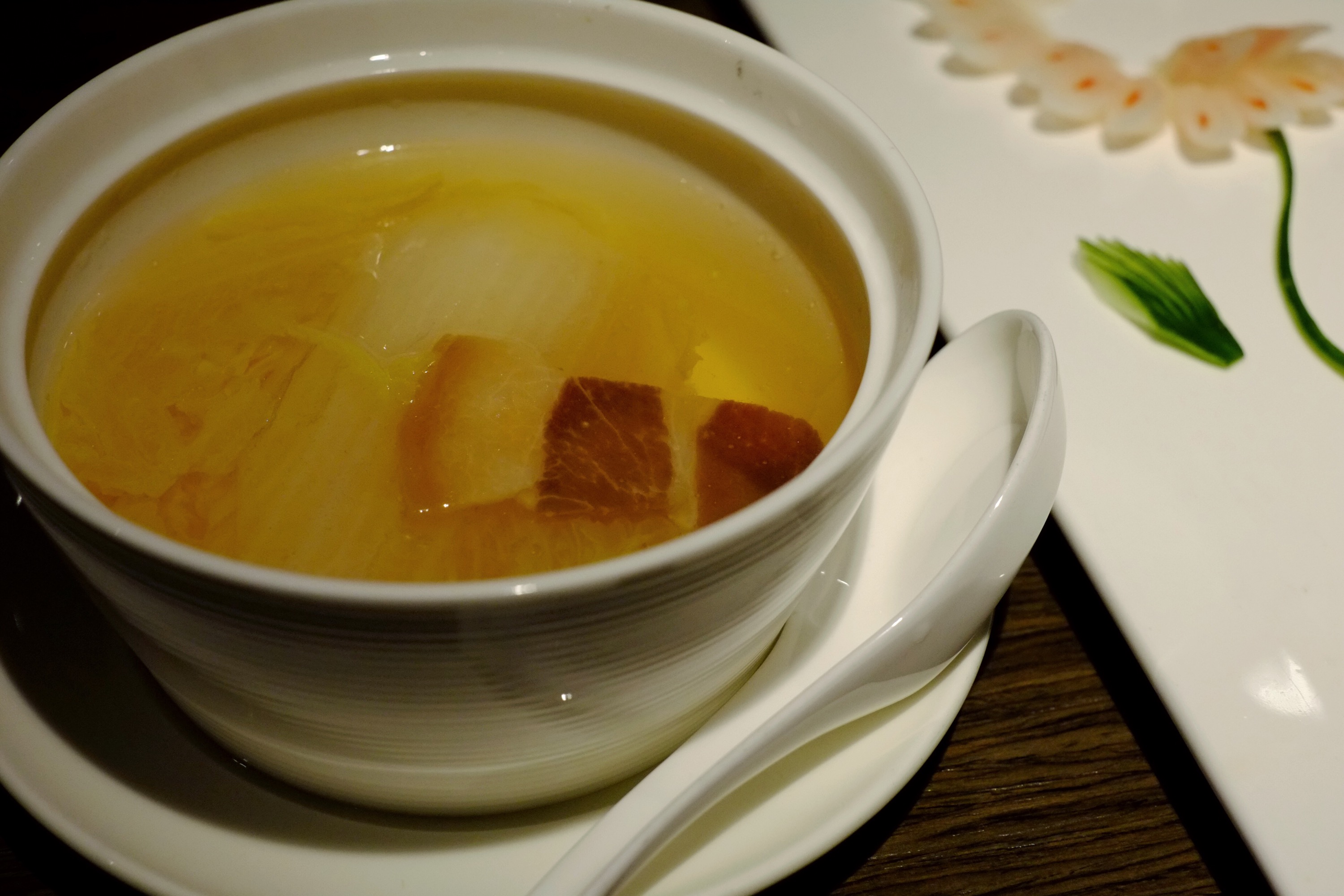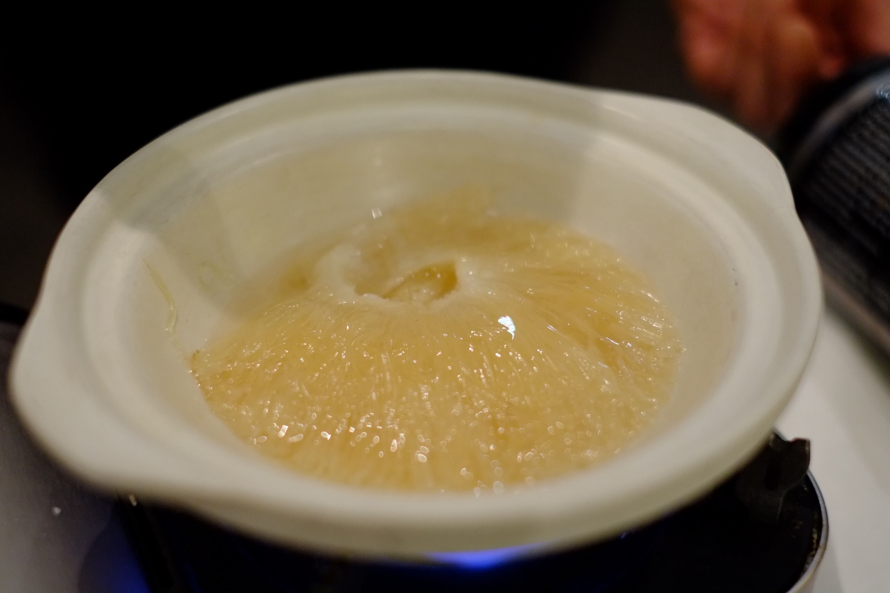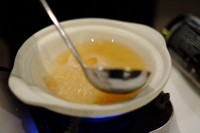 Take the soup course, the waiter serves me a tablespoon full of the broth- seeking my approval for the balance of taste, prior to submitting the golden cream to a final blast of heat served in a claypot. A soup sommelier(?!) This is a pork based soup that’s balanced with terra and mare (earth and the sea).