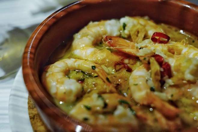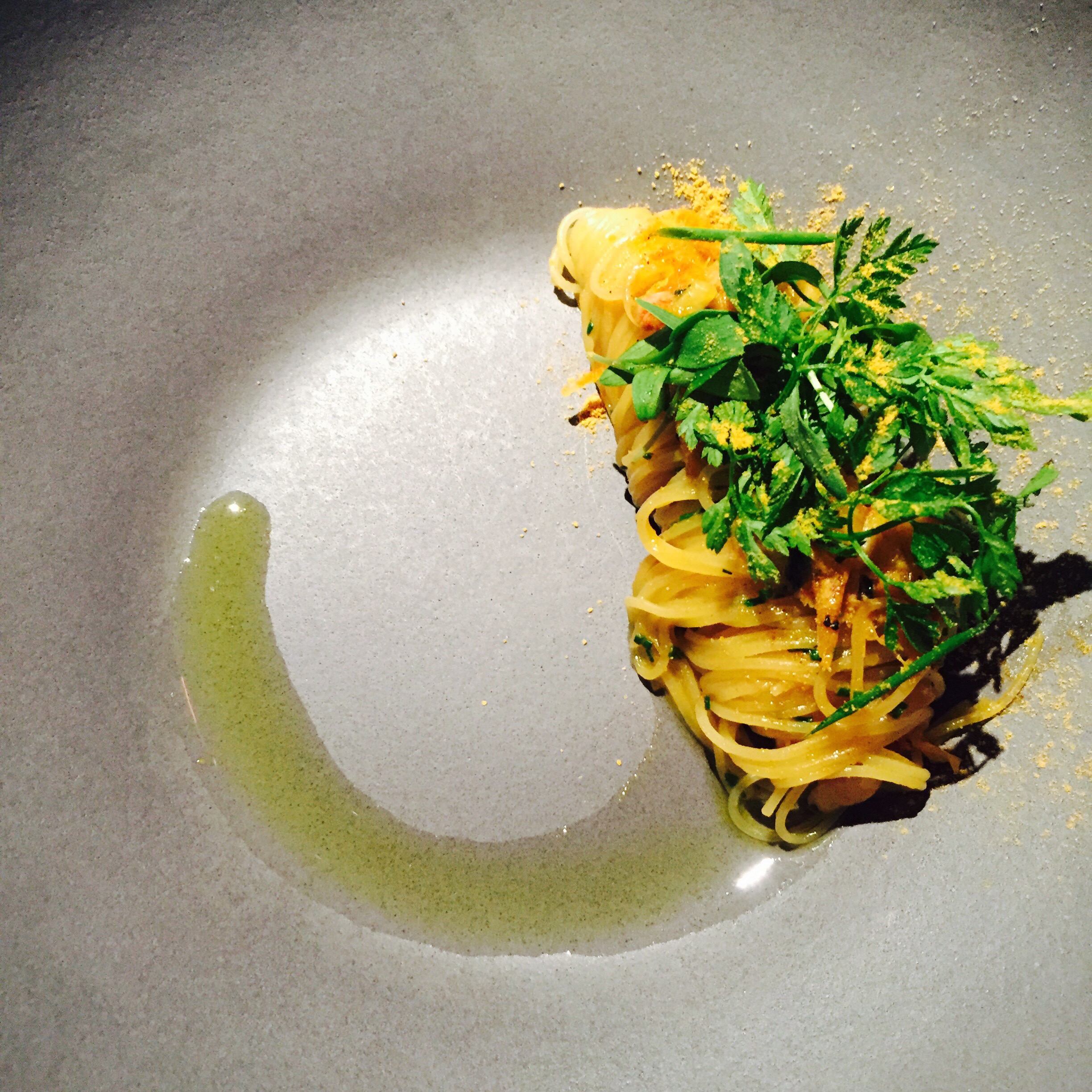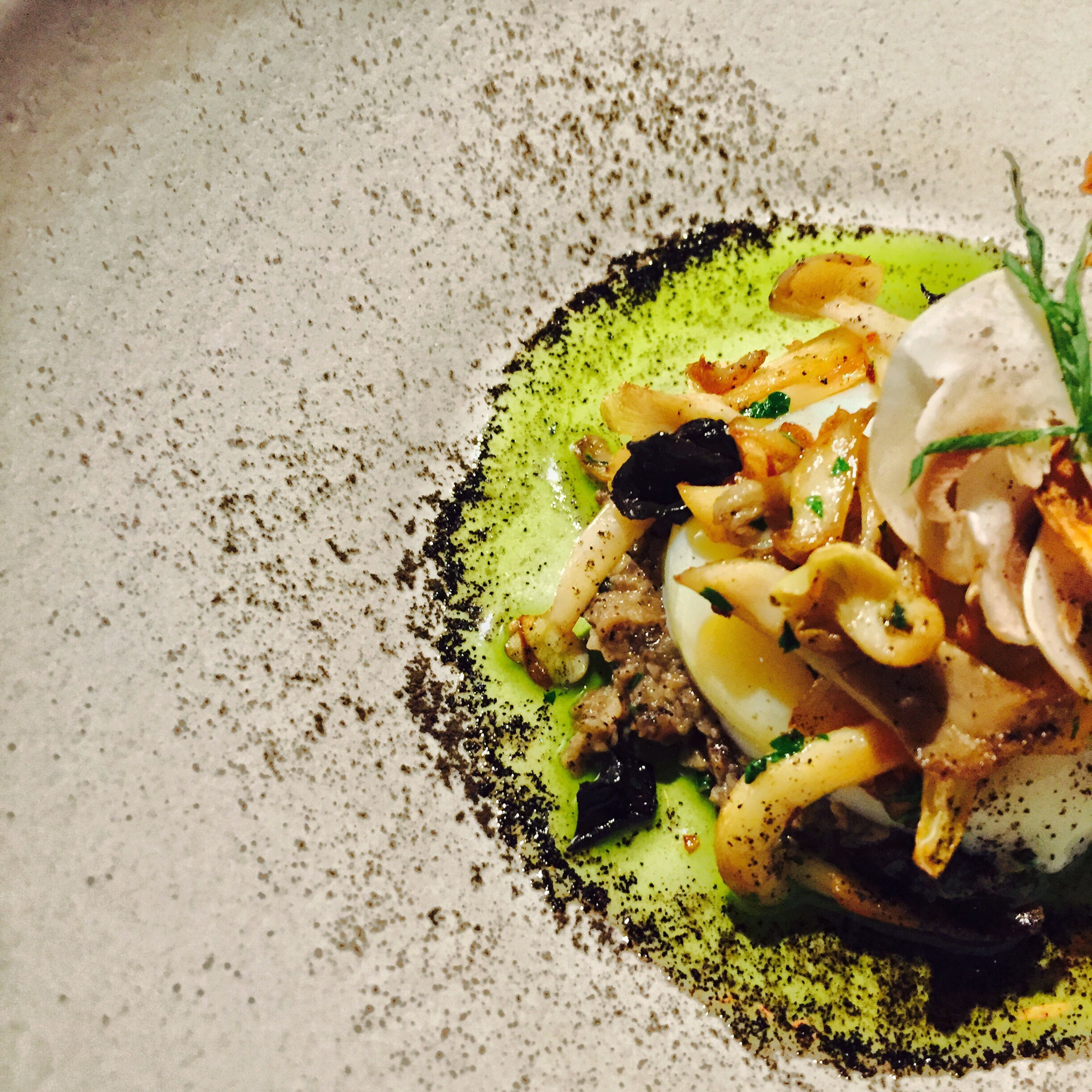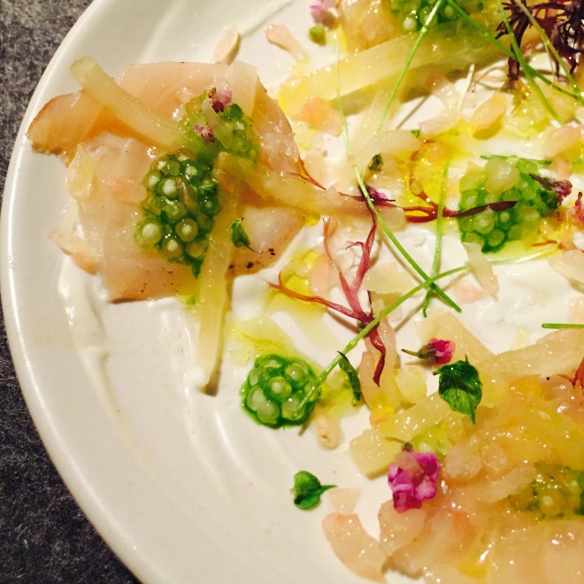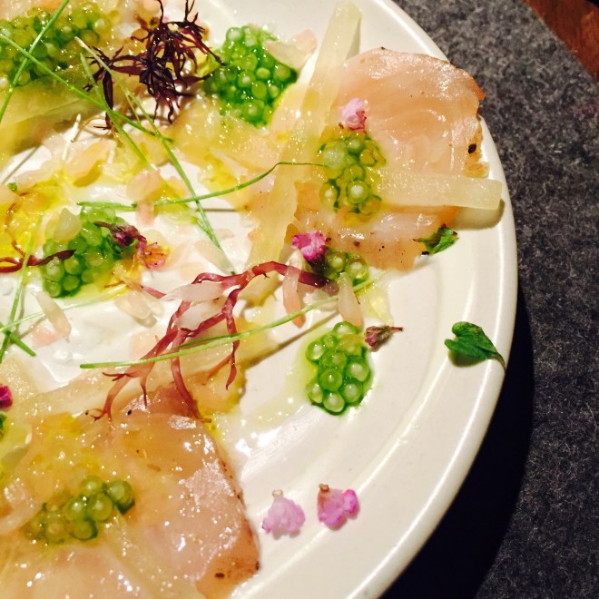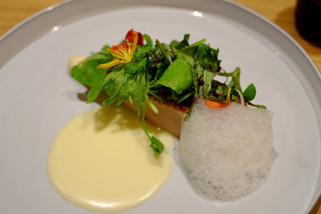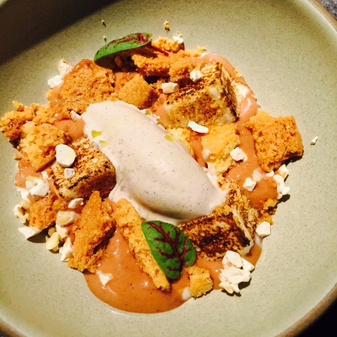 The next two were savoury notes. The first being chicken skin and cauliflower purée infused with masala spice. This provided an earthy counterpoint to the grapes and mint amuse. The second starter was “livers”, they were airy and luscious. Perfectly punctuated by spice and fresh herbs. Clearly one per person was not enough!