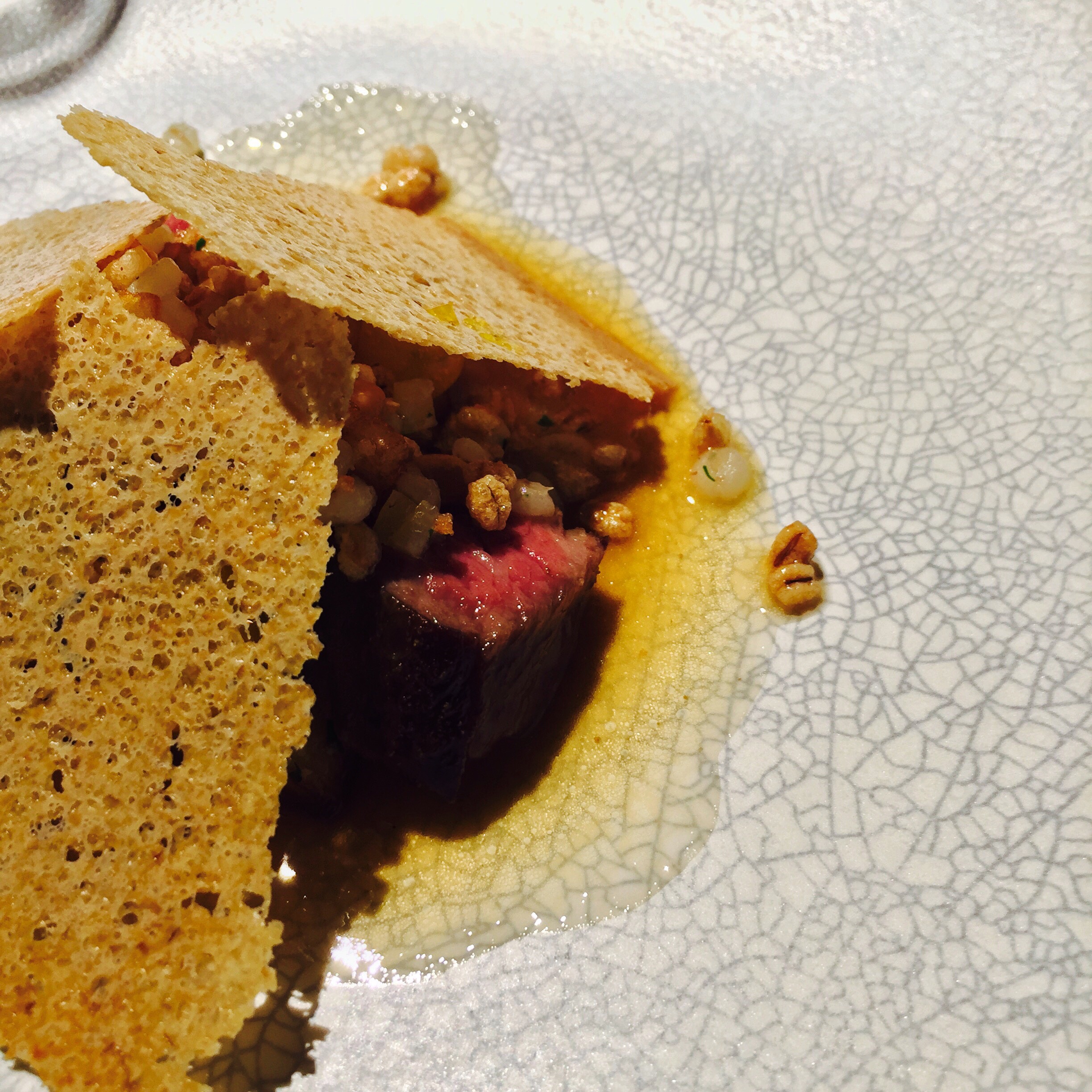 Main courses were a well executed cod with “burnt” cabbage and onion purée while the meat course was beef short rib (I suspect sous vide but with restraint, the absence of overtly soft and sometimes mealy texture was a hint for me) with “breakfast cereals”.